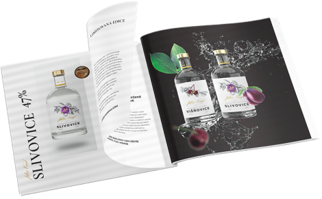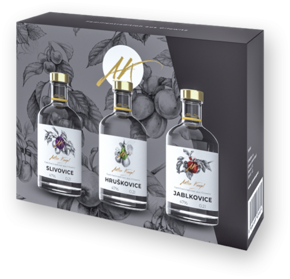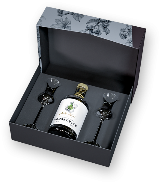 Luxuriöse Geschenkverpackungen – eine Klappbox aus festem Papier mit einer Dicke von 1,4 mm mit farbigem Offsetdruck und versehen mit einer matten Folie, in dem sich eine Flasche unseres Qualitätsobstbrandes und Degustationsgläsern aus böhmischen Glas finden.